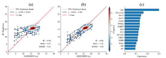 图 1. 橡胶林冠层高度模型的精度验证结果:a)无林龄模型,b)有林龄模型及c)模型变量重要性排序.