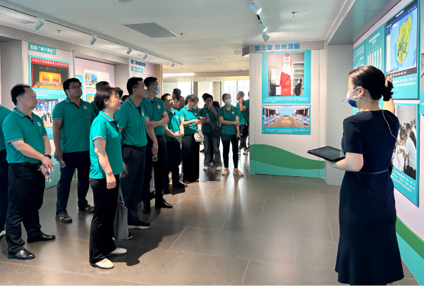 在讲解员的生动讲解下,全体人员集体学习了习近平总书记关于全面从严治党的重要论述,参观了清廉之港、纪法之弦、覆车之鉴、南海清风、红色家书5个主题展厅。通过场景设计、涉案实物展示、多媒体互动触摸屏和VR全景等方式,全体人员在真实鲜活的案例和图文并茂的说明中,真切感受到了全面从严治党背景下,党中央坚持反腐无禁区、全覆盖、零容忍,持续推进党风廉政建设和反腐败斗争的坚定决心。违纪违法人员发自内心的忏悔,也深深触动了在场的每一位观看者,大家深切感受到了法纪之威严、自由之可贵、贪欲之危害。