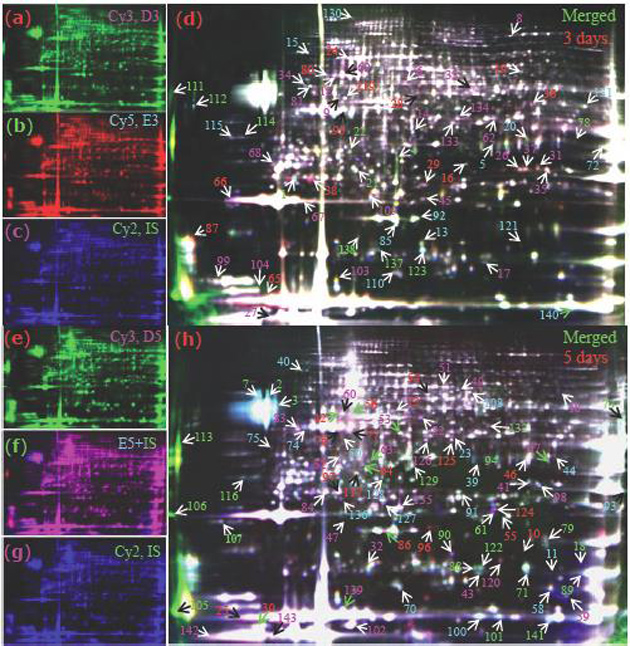 乙烯能够极显著促进胶乳生产,但相关基因并没有收到明显诱导,这一直是困扰天然橡胶生物合成调控机制研究的一个谜。通过定量蛋白质组DIGE和iTRAQ技术,该团队首次绘制了巴西橡胶树胶乳全蛋白2-D DIGE凝胶图谱并通过高端生物质谱鉴定到143个乙烯应答蛋白(图1),通过iTRAQ技术,获得了1600个胶乳蛋白以及404个响应乙烯刺激蛋白,进而通过磷酸化蛋白质组技术,鉴定了59个磷酸化胶乳蛋白质。分析这些差异蛋白可能的生物学功能,并进行了后续部分功能验证,发现乙烯刺激胶乳增产,主要在蛋白质翻译后修饰水平。