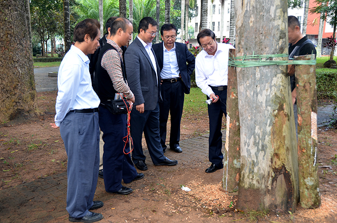 12月22日,王庆煌院长一行现场考察了橡胶所研发的第二代电动胶刀,亲自持刀试割检验效果,并提出要加快推动电动胶刀的研发工作。