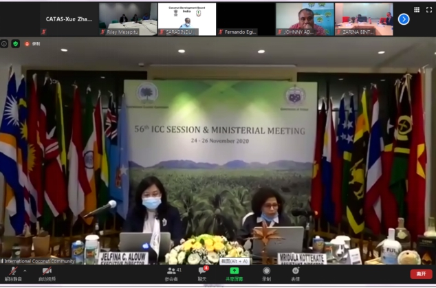 应国际椰子共同体(ICC)执行董事的邀请,经农业农村部批准,中国热科院院王富有研究员、范海阔研究员等6人于11 月 24日至26日作为观察员组织代表参加第56届国际椰子共同体视频会议及部长级会议。