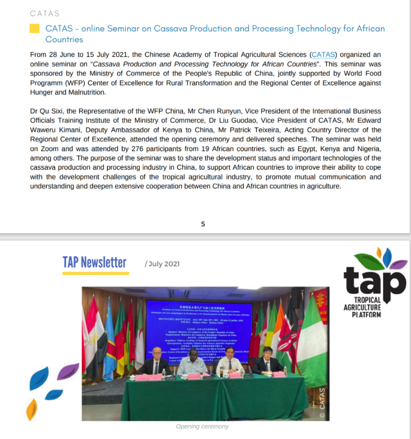 近期,联合国粮农组织(FAO)热带农业平台(TAP)在2021年第二季度的新闻简报里报道了中国热科院举办非洲国家木薯生产与加工技术培训班的内容。TAP是FAO发起的重要国际热带农业平台,旨在提升全球热带农业创新体系能力建设。加强对热区国家开展农业技术培训也是TAP重点支持的领域之一。中国热科院长期以来致力于为热区发展中国家提供技术培训,对促进热带农业创新能力建设具有重要作用,也受到了FAO的肯定和支持。