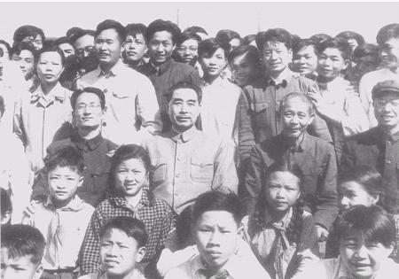 1960年2月9日下午,周恩来总理在院视察时与所院领导、科教员工、大中小学生在研究大楼前的广场上合影。
