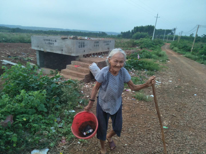 年迈老阿婆拄着拐杖坚持前往村里集中处理点倒垃圾
