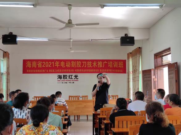 为提高天然橡胶割胶效率,降低割胶劳动强度,促进橡胶产业增效,加快农业农村现代化建设,10月20日-22日,海南省农业机械鉴定推广站联合澄迈县工业信息化和科学技术局、中国热带农业科学院橡胶研究所、澄迈县农业科技110文儒服务站,在澄迈县国营红岗农场联合举办2021年电动割胶刀技术推广培训班。来自屯昌县与澄迈县共50余名橡胶种植户与橡胶割胶工人员参与培训。