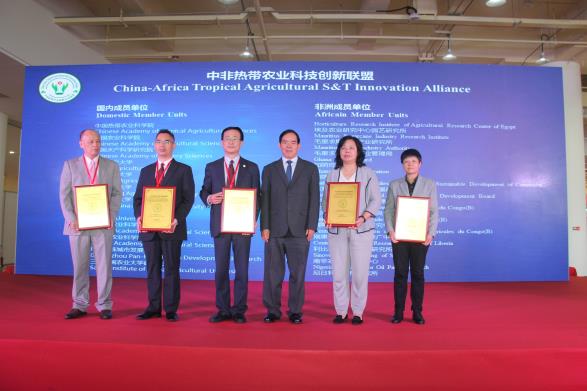中非热带农业科技创新联盟正式成立,来自中国水产科学研究院、南京农业大学、江西省农业科学院等国内成员单位代表参加授牌仪式,埃及农业研究中心、毛里求斯甘蔗产业研究所、利比里亚中央农业研究所等非洲科教机构向大会发来视频致辞。通过了联盟章程、行动计划,宣布了联盟成员单位,目前已有国内12家农业科教机构和非洲10个国家的13家国家级农业科教机构自愿申请加入。