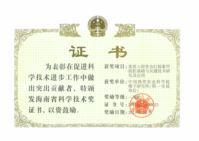 成果简介:该成果以红棕象甲种群防控为核心,开展了一系列系统深入研究,构建了发生量预测模型,精确度达95%,为该虫关键技术的研发奠定了坚实的科学基础。、研发出声音早期诊断实用技术。将田间疫情诊断由90天缩短到7天,准确预报率达80%以上,使化学防治用药量减少约60%;发明了红棕象甲聚集信息素引诱剂、诱芯及诱捕器,其持效期延长90天,诱捕效能提高31.4%。筛选出防效良好的混剂配方,明确了最佳田间施药方法“打点滴”,田间致死率达93.9%;筛选出致病力高的菌株,研制出防效好的剂型及配套技术,田间致死率达26.8%。该成果在海南、广东、广西、福建、云南等省区陆续推广应用,示范推广面积达61.8万亩次,挽回经济损失1.81亿元,显著提升了对红棕象甲的整体防控能力和水平,有效地保护了棕榈植物的安全生产和生态环境。该成果获2013年海南省科技进步一等奖。
