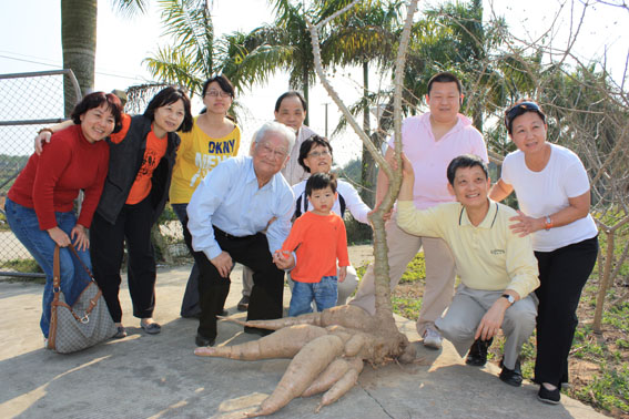 何康同志深怀着木薯情节,赞叹目前培育出品质好、产量高的优质木薯。说起当年如何发动大家自力更生种植木薯等解决生存与发展的粮食问题,大家靠木薯度过了饥饿的3年。他领着儿孙们去看当时的“救命粮”—木薯,四代人还在木薯前合影留念。