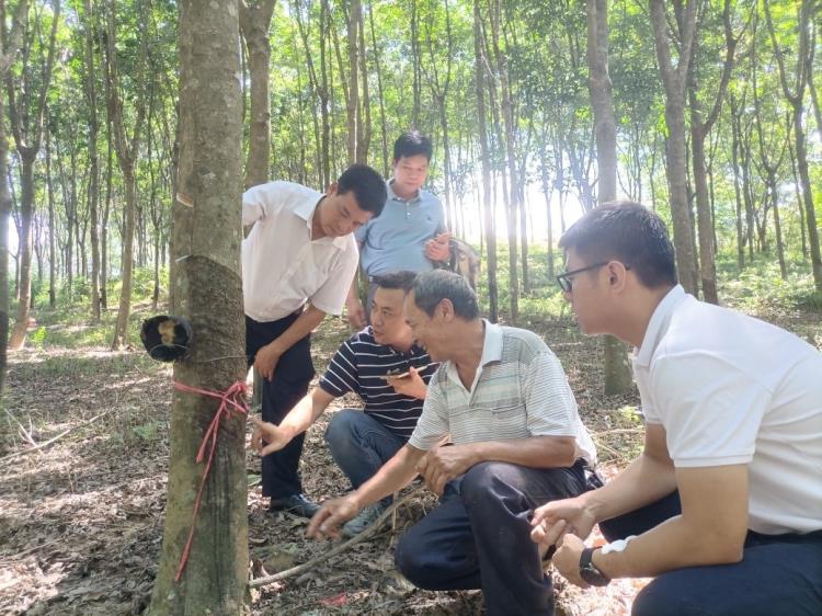 到达现场后,橡胶所王真辉副研究员经仔细诊断,对胶农的疑问做出解答。他指出,橡胶树割面出现较大伤口,与胶农超深割胶尤其是年度低温胁迫下超深割胶有关;树身局部出现树皮干涸、木质部腐烂现象,初步诊断为寒害引起局部爆皮流胶,继而受病菌侵染引起的树皮干腐病。针对上述情况,专家提出了重视种苗质量、科学割胶、加强林段管理、及时处理病树的综合防治措施。