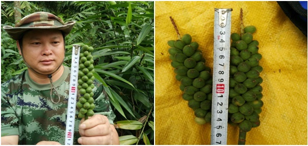 根据测算结果表明:益智单丛产鲜果平均数量25串,平均单丛产量4斤,亩产鲜果可达300斤,预计干果亩产80斤,产量比去年提高了30%左右。