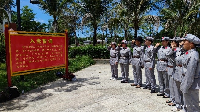 黎族文化百米浮雕展示了多彩黎锦、田园耕作、外出狩猎、庆祝歌舞等黎族人民的生活场景,讲述了坡村从一个落后的小村庄发展成为风景优美生态黎村的光辉历程,全体党员切身感受到海南黎族人民在党的领导下,生活发生了翻天覆地的变化。随后,全体党员在英雄雕像前重温了入党誓词并郑重宣誓,进一步增强了全体党员的责任感、使命感和荣誉感。