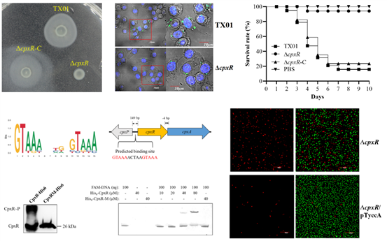 本研究发现CpxR与杀鱼爱德华氏菌抗高温、高渗和抗生素等抗逆性密切相关;CpxR缺失严重削弱了细菌细胞膜完整性,显著降低了细菌抵抗宿主血清、运动性和生物膜形成能力;致病性实验表明CpxR对于杀鱼爱德华氏菌粘附上皮细胞、存活于吞噬细胞、定植宿主组织和促进全局性感染等方面至关重要;鉴定了CpxR新的靶基因yccA,发现CpxR以依赖于磷酸化修饰的方式直接调控内膜蛋白YccA,这一调控作用对于杀鱼爱德华氏菌维持细胞膜完整性具有决定性作用。这些结果表明CpxR是杀鱼爱德华氏菌重要毒力调控因子。研究结果有助于深入了解CpxRA双组分调控系统在水产病原菌中调控机制。