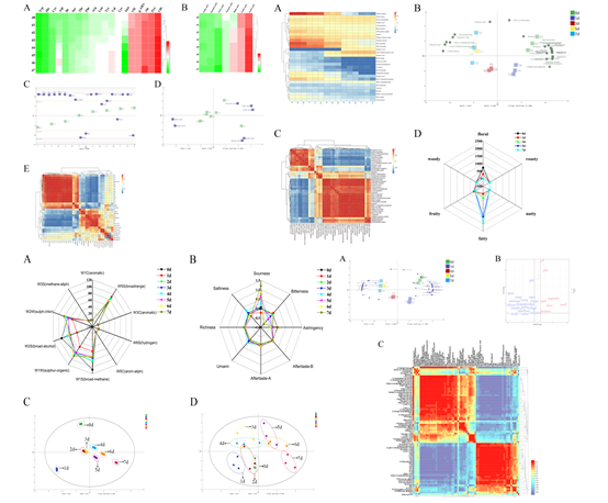 该研究首先利用中试设备进行了菠萝果醋生产,并利用电子鼻和电子舌监测了发酵过程中香气和口感的变化,电子鼻结果显示,随着发酵时间的延长,酒精的相对含量逐渐降低,而萜烯类、芳香类化合物的相对含量显著增加,表明在发酵过程中,酒精被消耗,同时产生了各种风味物质。电子舌结果显示,与发酵初始阶段相比,菠萝醋表现出明显的酸味,同时还具有更强的咸味和鲜味,且后味、苦味和涩味较弱。同时,通过PCA主成分分析,发现发酵初期风味物质发生了显著变化,随后便逐渐趋于平稳。挥发性化合物(VOCs)和感官特性分析显示,在发酵的前4天,菠萝醋的VOCs特征发生了明显变化,而后趋于稳定。在醋酸发酵过程中,菠萝醋中的酯类化合物含量显著降低。大部分酯类化合物的气味活性值(OAV)呈下降趋势,而有机酸的OAV值则显著增加,乙基-2-甲基丁酸酯的OAV值显著增加,给菠萝醋带来了“甜”味,醇类化合物如乙醇、丙醇等的OAV值较高,对菠萝醋的香气有重要贡献。对发酵过程中的总酚含量和抗氧化活性分析显示,总酚含量在菠萝酒和菠萝醋中保持相对稳定,但各个酚类物质的含量发生了较大变化,菠萝醋对DPPH自由基和FRAP清除能力保持稳定,而对HFRC自由基清除能力显著增强。该研究系统揭示了菠萝醋发酵过程中营养物质、风味和口感的变化,为高品质菠萝醋生产提供理论支持。