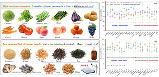 盐酸吗啉胍是一种广泛应用于农业的水溶性杀菌剂,其在食品中残留可能通过食物链积累,对人体健康和生态环境造成潜在风险。本研究将植物源食品按照含水、含油量进行分组,研发了针对性的提取和净化方法。对于蔬菜和水果等高含水量的样品,采用三氟乙酸溶液进行提取;对于坚果和植物油等低水分、高油含量的样品,则使用甲酸溶液,并通过调节pH值去除杂质干扰。通过超高效液相色谱-串联质谱进行检测,方法的准确度、灵敏度均满足分析的需求,适用于不同类型植物源食品中盐酸吗啉胍残留的分析。