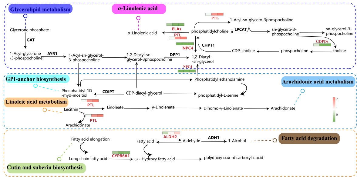 研究发现,无籽油棕果实中共鉴定出5个脂质大类,26个脂质亚类,518个脂质单体分子。通过KEGG联合分析,筛选出与脂质合成和代谢最显著相关的通路,包括Alpha-Linolenic acid metabolism、GPI-anchor biosynthesi、Arachidonic acid metabolism、Linoleic acid metabolism、Fatty acid degradation、Cutin, suberine and wax biosynthesis(图1)。进一步的关联分析表明,ALDH、PTL、CYP86B1、NPC4、GDPDs1、PLAs等基因可能参与调控甘油脂类、脂肪酰类和甘油磷脂类的合成(图2),在脂质代谢途径发挥关键作用。本研究为阐明无籽油棕果实采后酸败过程中脂质合成与代谢的调控机制提供了重要基因资源,通过调控这些关键基因的活性,有望有效抑制采后贮藏期间的脂质降解,从而延长棕榈油的储存期限,提升其加工品质和稳定性。