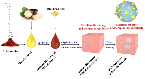 近日,中国热科院南亚所热带特色资源加工与高值化利用团队揭示了不同组分配比对澳洲坚果油凝胶网络强度及乳液热响应性能的影响机制,首次系统评估了该体系在虾青素递送与体外释放中的表现,为新型固体脂肪、无表面活性剂乳剂以及调节脂质消化和控制营养物质释放的功能食品的开发提供指导。