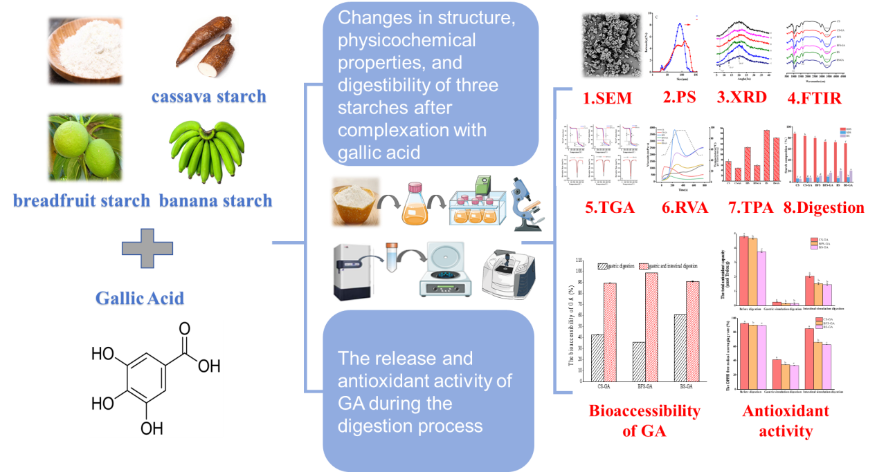 近日,中国热带农业科学院香料饮料研究所加工与工程技术研究团队利用没食子酸(Gallic acid, GA)与木薯淀粉、面包果淀粉及香蕉淀粉三种热带特色淀粉构建复合体系,发现复合后淀粉的慢消化和抗性淀粉含量显著提升,同时没食子酸在模拟消化过程中生物可及性超过90%。研究为开发具有控糖、抗氧化双重功能的淀粉基功能性食品提供了新路径。