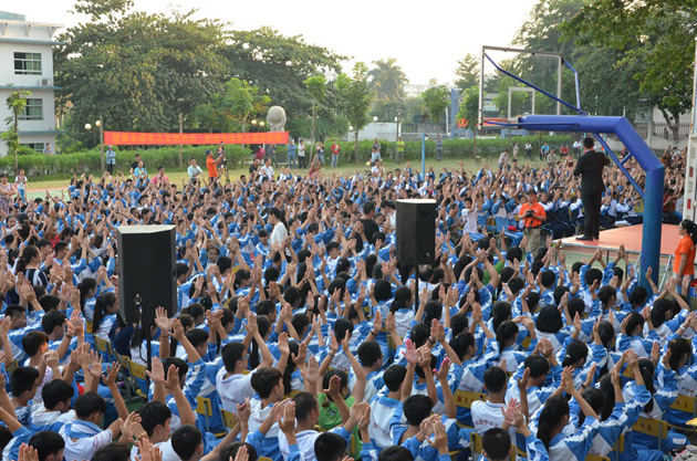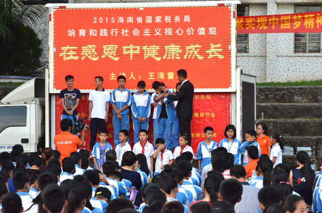 10月19日,由海南省文明办、省教育厅、儋州市精神文明办、市教育局、市国税局等单位联合主办,附中承办的“未成年人道德讲坛”进校园,由王海童老师主讲的“在感恩中健康成长”的励志教育主题演讲活动在附中举行。省市相关部门领导、校领导班子、全体中小学师生及部分家长一千多人参加活动。