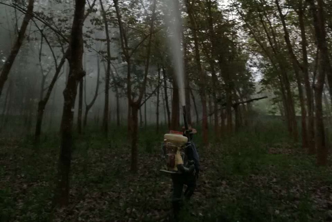 为做好今年橡胶树白粉病监测防控工作,防止橡胶树白粉病大面积发生流行,根据物候、气候等情况及病情发展动态,我场分别于3月29日、4月6至7日组织各生产连队在橡胶林喷撒硫磺粉,防治面积达10900亩,确保了橡胶树第一蓬叶健康生长。