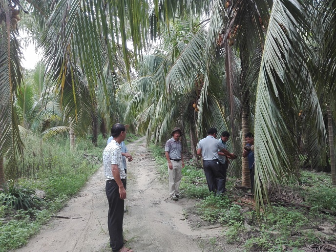 在万宁礼纪镇,项目组查看了槟榔植株发生黄化病的症状,对槟榔黄化病严重影响槟榔产量有了很直观的了解,对不从疫区购买种果、种苗的重要性有了深切的感受。此外,项目组还参观了解了香饮所椰子、槟榔林下间作香草兰、可可、咖啡、胡椒等模式。