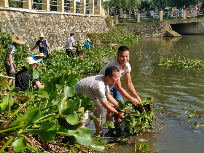 热烈的阳光下照耀着张张微笑的脸庞,和煦的微风中飘扬着阵阵干活的喊声。青年志愿者们都自告奋勇,通力协作,有的用铁耙打捞,有的直接用双手拖拽,积极发扬不畏艰苦,连续作战的精神,挥洒汗水间共同将水坝中大把大把的水浮莲清理到岸边。他们双脚浸泡水里,不怕蚊虫叮咬,还时时传出欢声笑语。经过一天的忙碌,青年志愿者们收获颇丰,河面上数吨的水浮莲被清理干净,周围的居民和路过的群众纷纷为他们点赞。