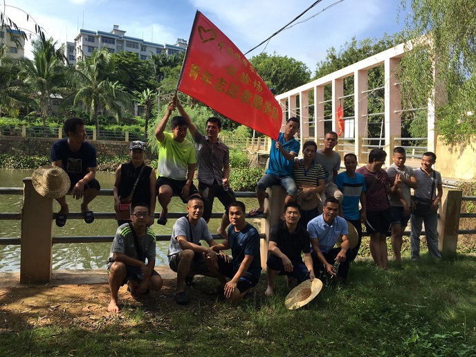 为美化院区生活环境,净化河道水质,8月25日,我场十七名青年志愿者们齐聚九队水坝,顶着烈日,撸起裤腿,清理漂浮于河面的水浮莲。