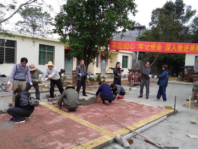 经过两个小时的紧张忙碌,大家铺完了三个停车位。每个停车位黄黄的边框,红红的内里,平整美观。一块块红砖像一颗颗火热的心,通过一双双温暖的手,温热了大地,美丽了试验场。
