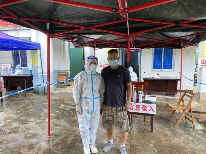 试验场综合服务中心符荣护、橡胶所彭欣荣是一对夫妻。他们二人于8月14日参加疫情防控工作,主要在试验场五队核酸采样点,负责信息录入,秩序维护。完成志愿服务后,彭欣荣还要去单位完成繁忙的部门工作。作为夫妻,他们相互陪伴,相守相依。作为战友,他们相互配合,共击疫情。经历疫情是不幸的,能彼此依靠却又是幸运的。