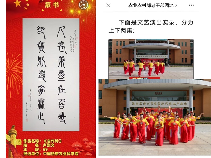 近日,农业农村部离退休干部局开展了以“喜迎二十大 奋进新征程”为主题的文艺汇演暨书画摄影作品展演展示活动,我院等7家京外单位以视频形式参加了文艺汇演,我院共选送3个文艺节目,1个歌唱类节目和2个舞蹈类节目,其中我场由16名退休女职工表演的舞蹈《嘱姑9点半》以视频的形式在农业农村部老干部局网站和老干部园地微信公众号进行线上展播;书画摄影作品展共征集到26个单位281幅作品,从中优选63幅作品展出,我场卢崇文老同志创作的篆书《自作诗》在活动中展出。
