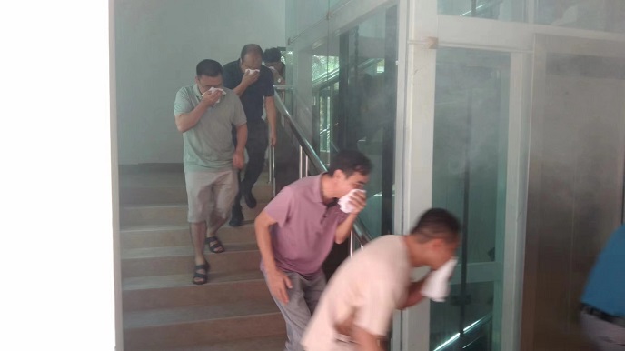 在应急逃生演练环节,主要模拟办公楼发生火灾。演练初始,烟雾弥漫和警报响起,安保人员第一时间拨打“119”报警并组织人员疏散和处置初起火灾。几分钟后,消防车赶到现场,消防指战员立即按照预案开展灭火救援。参训人员在消防队员和安保人员的引导下,沿着楼道楼梯,迅速通过各个安全出口,有序地离开了办公楼向广场汇合。在整个逃生疏散演练中,所有人员都按照火场逃生疏散演练技巧,分别采用毛巾和衣角捂住口鼻、弯腰低姿进行有序疏散,充分体现出了干部职工们良好的消防安全素质。
