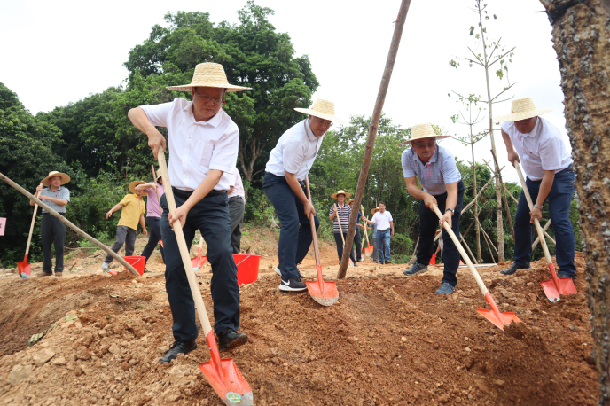座谈会结束后,院领导及其他参会人员还一同前往院场八栋房北侧的山坡上开展义务植树劳动,为新种植的木棉树、凤凰树和鸡蛋花树等回填泥土及浇水。