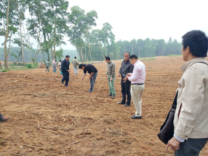 场科技生产办公室工作人员一同参加定标工作,认真、严格地按照《试验场橡胶更新种植指导方案》,为橡胶树种植穴测定位置,为高标准核心胶园建设打下坚实的基础。